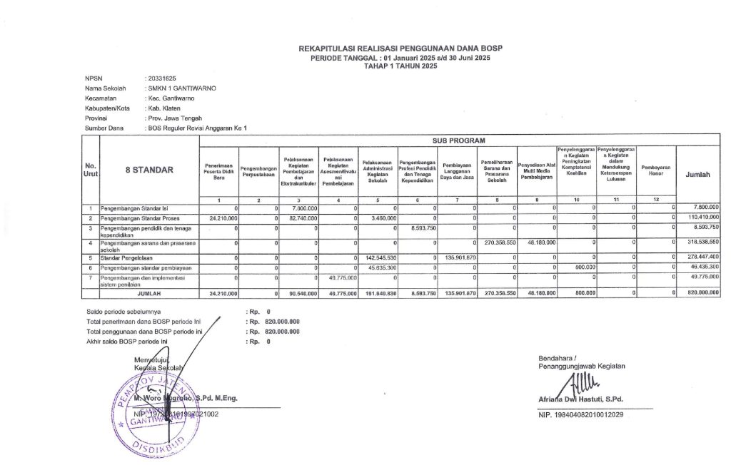 Berikut Rekapitulasi Realisasi Penggunaan Dana BOSP Periode Tanggal : 01 Januari 2025 s/d Juni 2025 Tahap 1 Tahun 2025